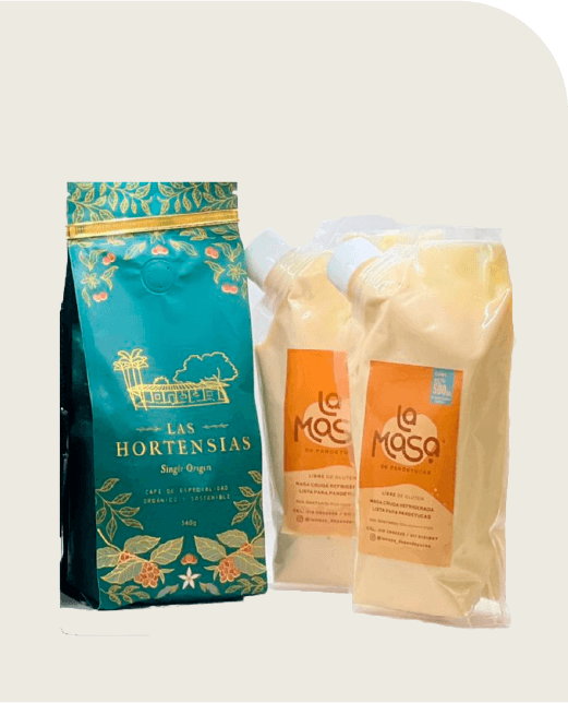 2 masas de yuca naturalmente libre de gluten, perfecta para preparar pandeyucas frescos en casa, fáciles y deliciosos y café de Finca Las Hortensias, Santander.